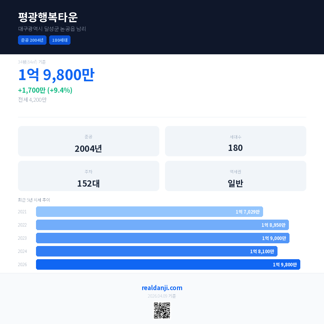 평광행복타운 국민평형 기준 2026년 평균 거래가는 1억 9,800만으로, 전년 대비 9.4% 상승 했습니다.
