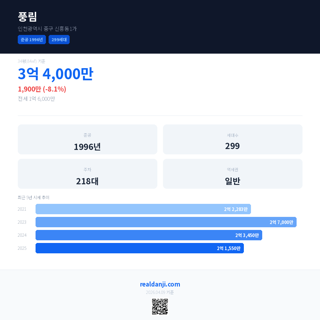 풍림 국민평형 기준 2025년 평균 거래가는 2억 1,550만으로, 전년 대비 8.1% 하락 했습니다.