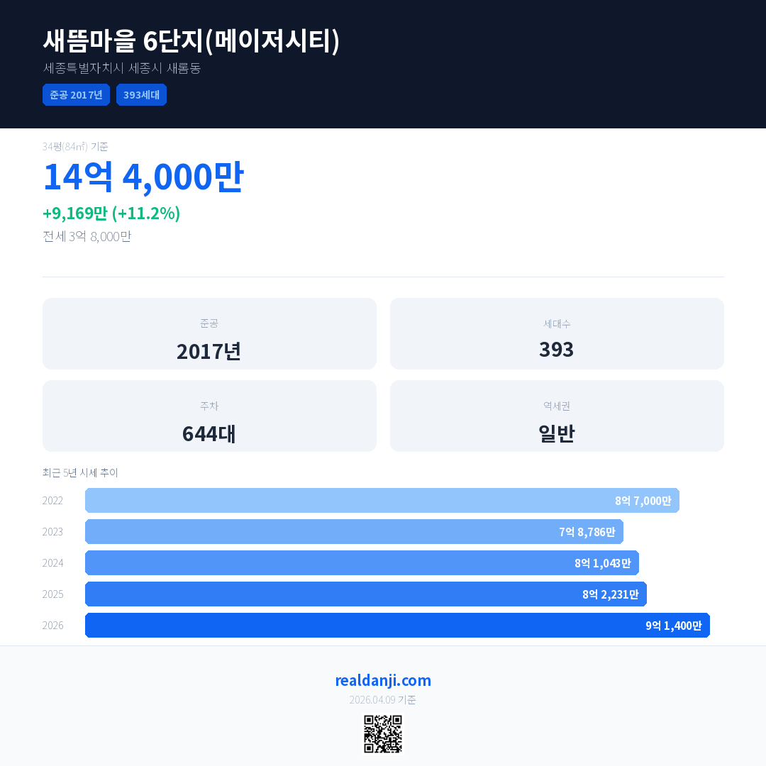 새뜸마을 6단지(메이저시티) 국민평형 기준 2026년 평균 거래가는 9억 1,400만으로, 전년 대비 11.2% 상승 했습니다.