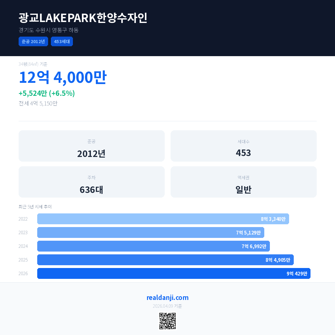 광교LAKEPARK한양수자인은(는) 2012년에 준공되었으며, 현재 14년차입니다. 총 453세대 규모입니다.