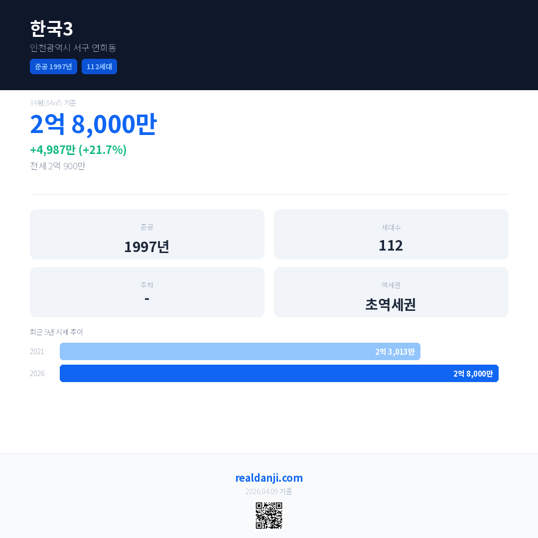 한국3 국민평형 기준 2026년 평균 거래가는 2억 8,000만으로, 전년 대비 21.7% 상승 했습니다.