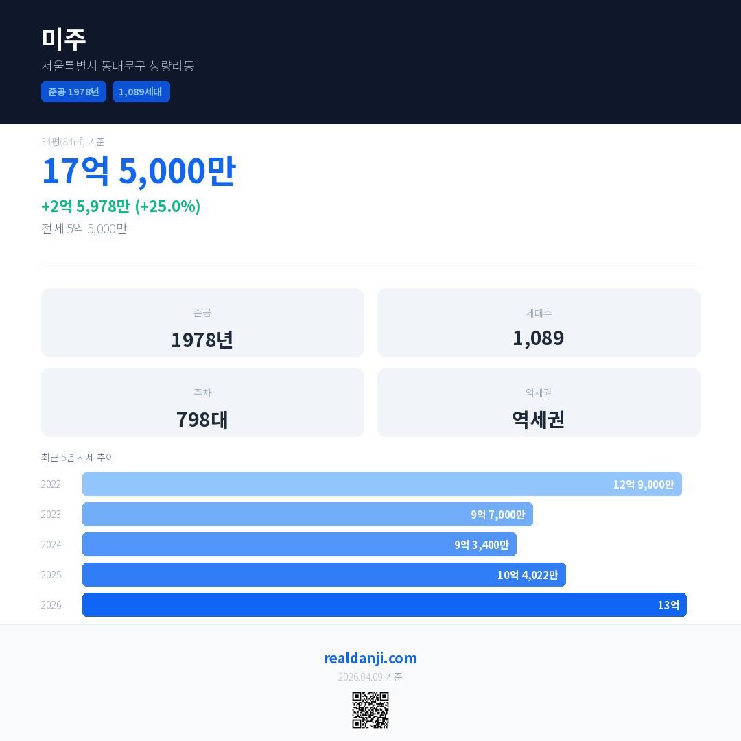 미주 국민평형 기준 2026년 평균 거래가는 13억으로, 전년 대비 25.0% 상승 했습니다.