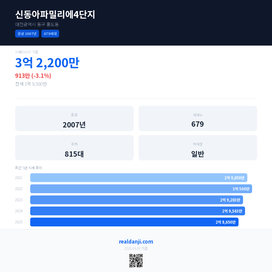 신동아파밀리에4단지 국민평형 기준 2025년 평균 거래가는 2억 8,650만으로, 전년 대비 3.1% 하락 했습니다.