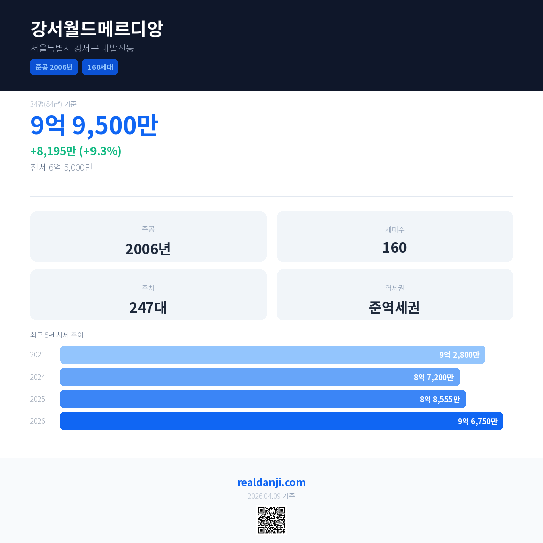 강서월드메르디앙 국민평형 기준 2026년 평균 거래가는 9억 6,750만으로, 전년 대비 9.3% 상승 했습니다.