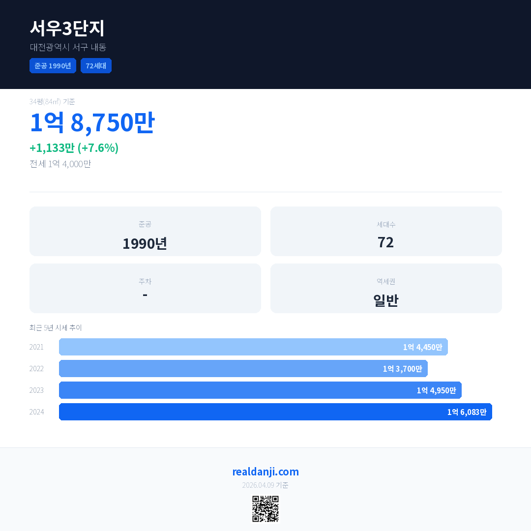 서우3단지 국민평형 기준 2024년 평균 거래가는 1억 6,083만으로, 전년 대비 7.6% 상승 했습니다.