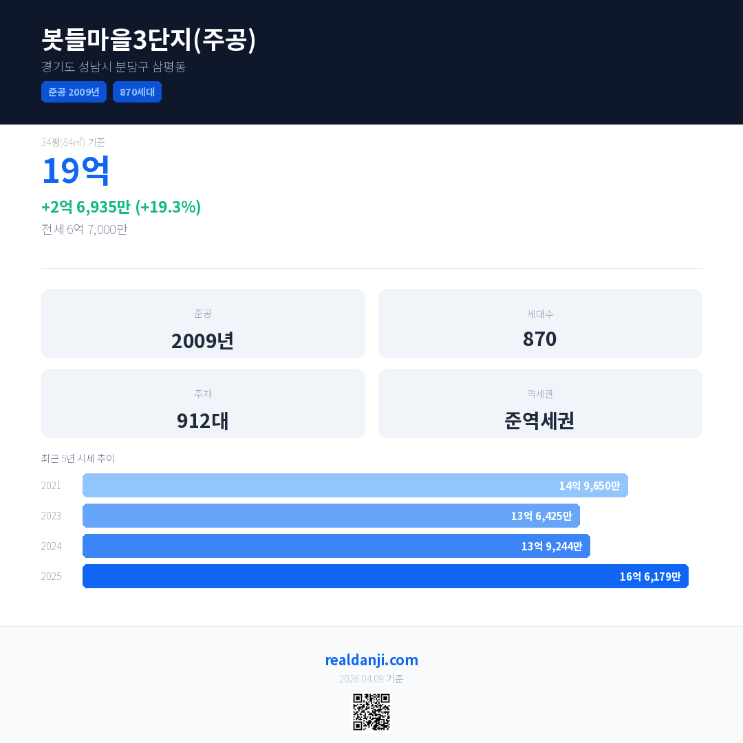 봇들마을3단지(주공) 국민평형 기준 2025년 평균 거래가는 16억 6,179만으로, 전년 대비 19.3% 상승 했습니다.
