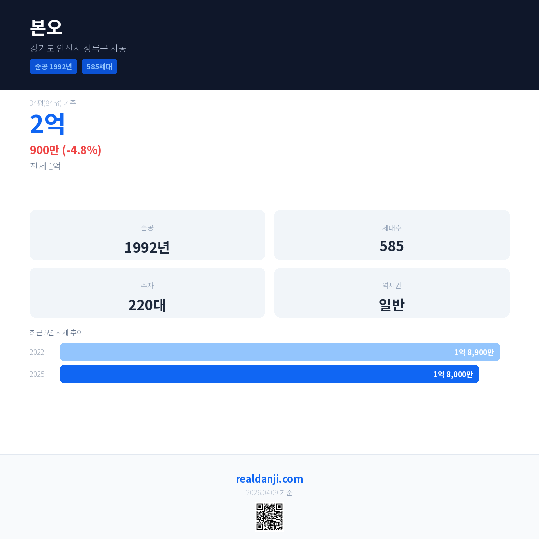 본오 국민평형 기준 2025년 평균 거래가는 1억 8,000만으로, 전년 대비 4.8% 하락 했습니다.