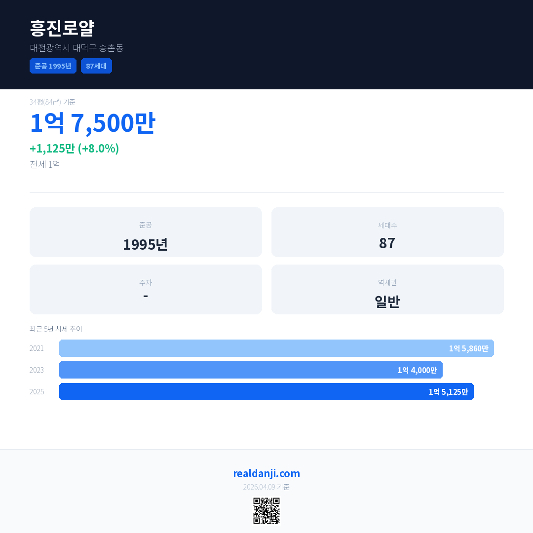 흥진로얄 국민평형 기준 2025년 평균 거래가는 1억 5,125만으로, 전년 대비 8.0% 상승 했습니다.
