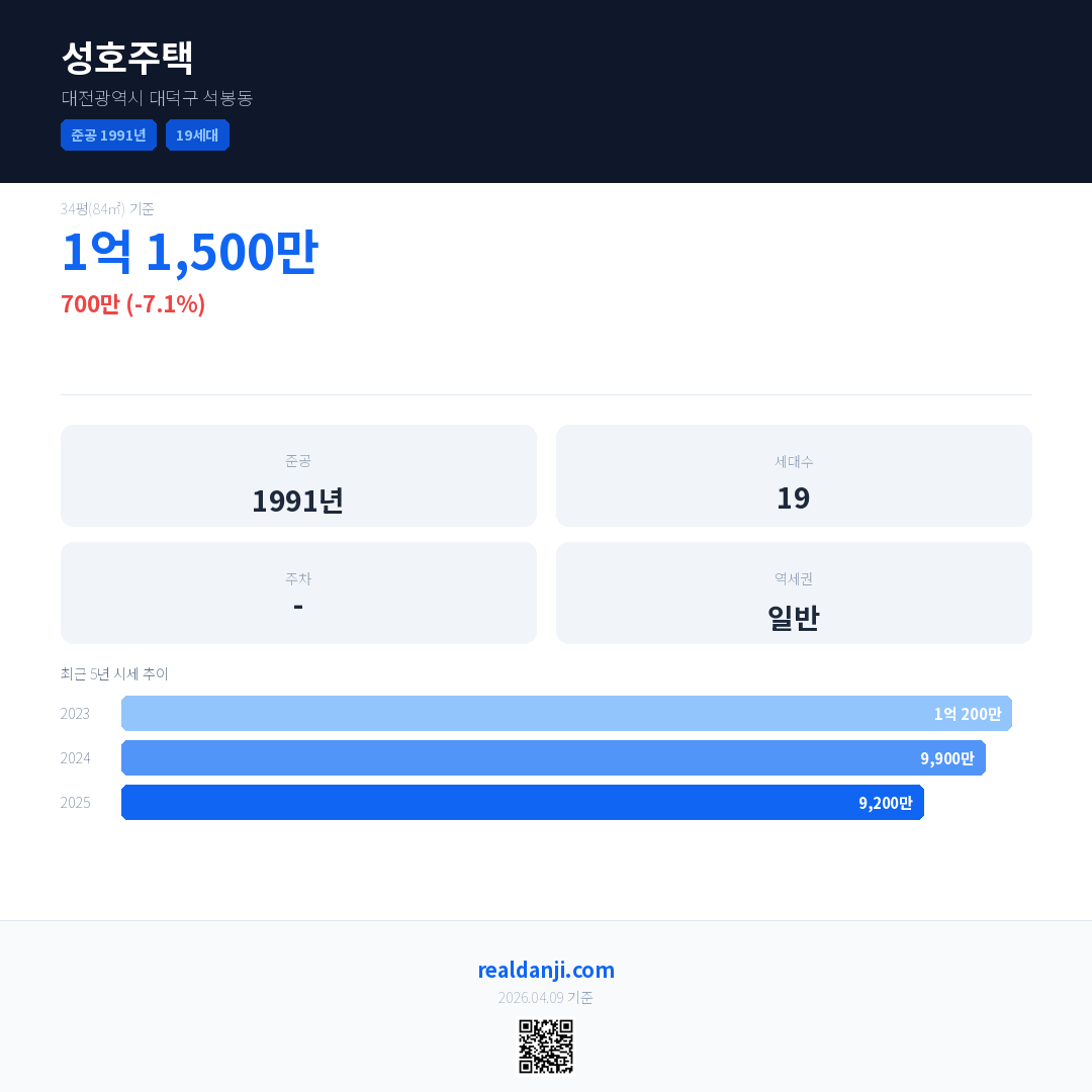 성호주택 국민평형 기준 2025년 평균 거래가는 9,200만으로, 전년 대비 7.1% 하락 했습니다.
