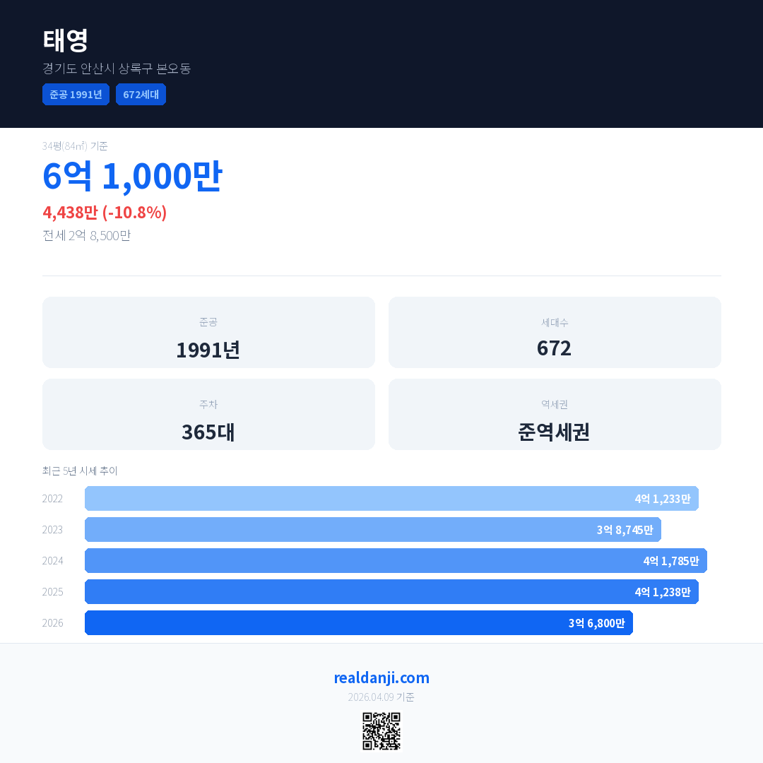 태영 국민평형 기준 2026년 평균 거래가는 3억 6,800만으로, 전년 대비 10.8% 하락 했습니다.
