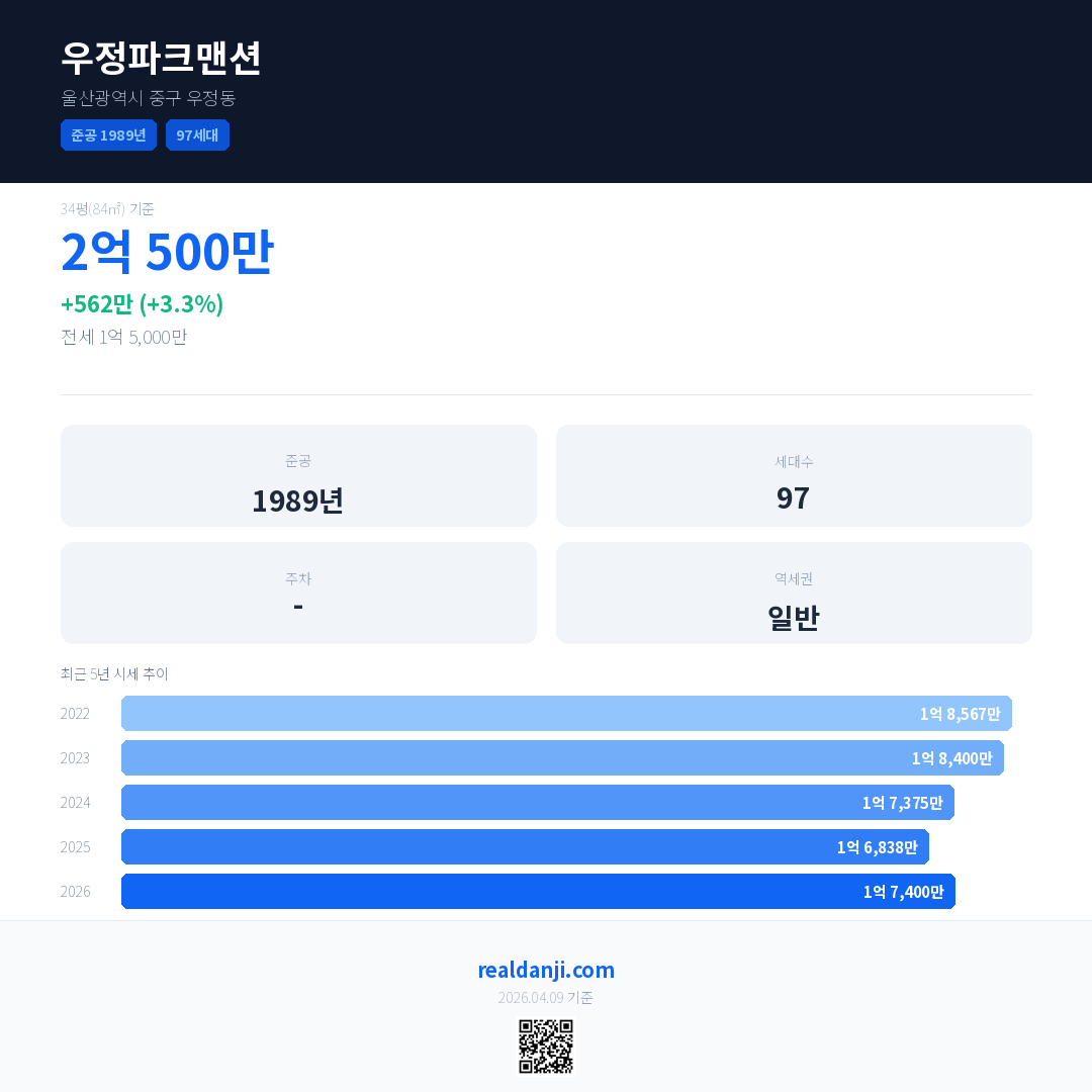 우정파크맨션 국민평형 기준 2026년 평균 거래가는 1억 7,400만으로, 전년 대비 3.3% 상승 했습니다.