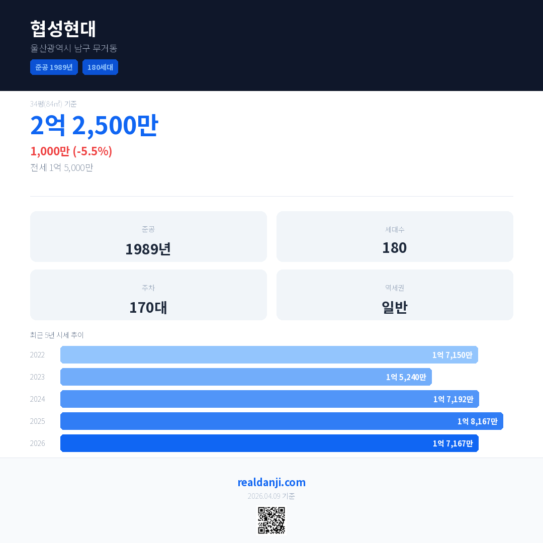 협성현대 국민평형 기준 2026년 평균 거래가는 1억 7,167만으로, 전년 대비 5.5% 하락 했습니다.