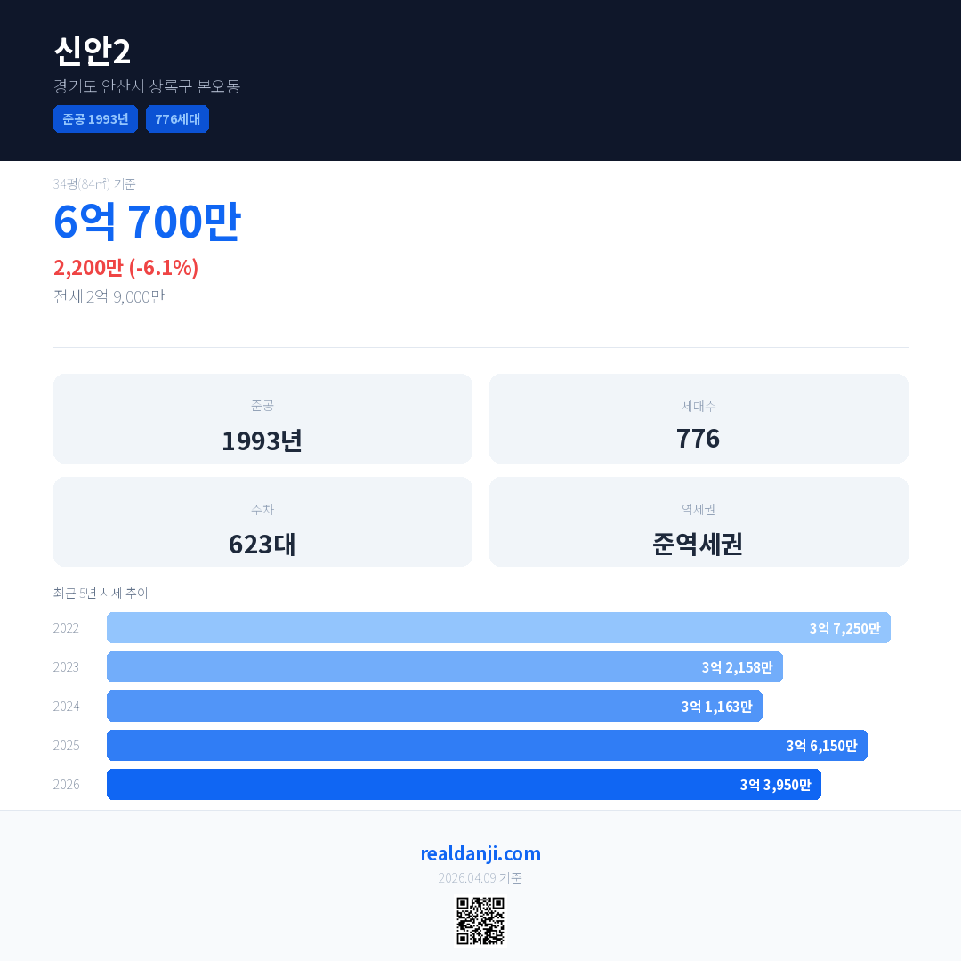 신안2 국민평형 기준 2026년 평균 거래가는 3억 3,950만으로, 전년 대비 6.1% 하락 했습니다.
