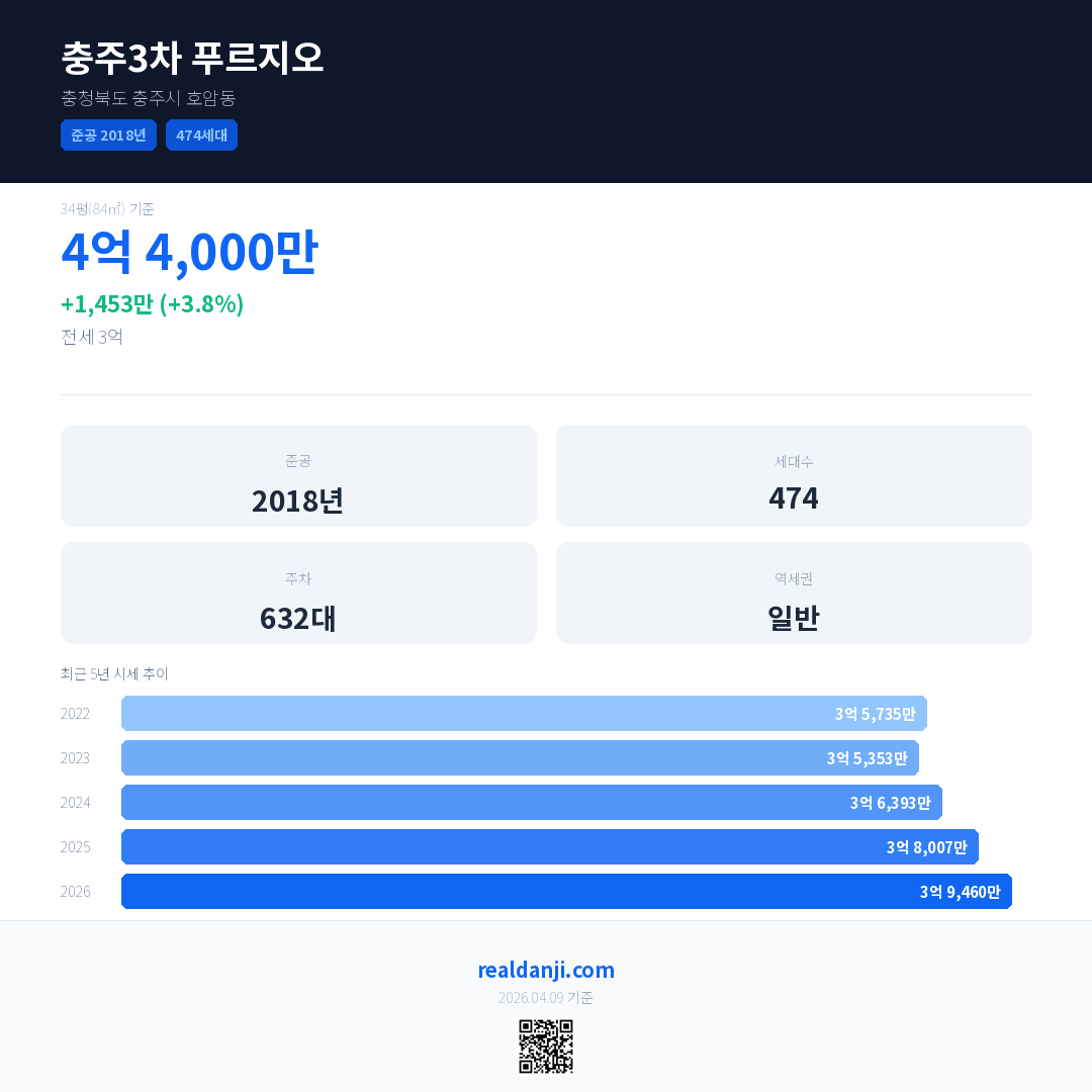 충주3차 푸르지오 국민평형 기준 2026년 평균 거래가는 3억 9,460만으로, 전년 대비 3.8% 상승 했습니다.