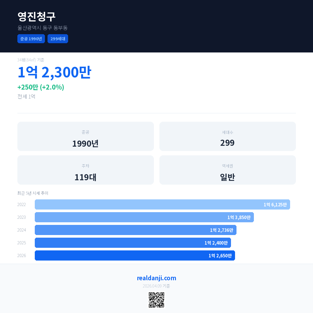 영진청구 국민평형 기준 2026년 평균 거래가는 1억 2,650만으로, 전년 대비 2.0% 상승 했습니다.