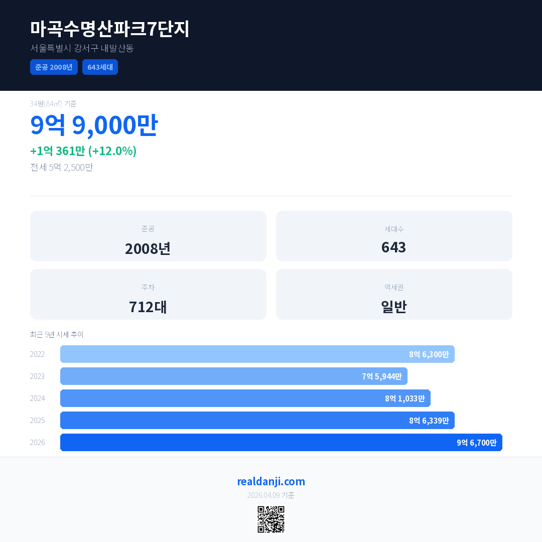 마곡수명산파크7단지 국민평형 기준 2026년 평균 거래가는 9억 6,700만으로, 전년 대비 12.0% 상승 했습니다.