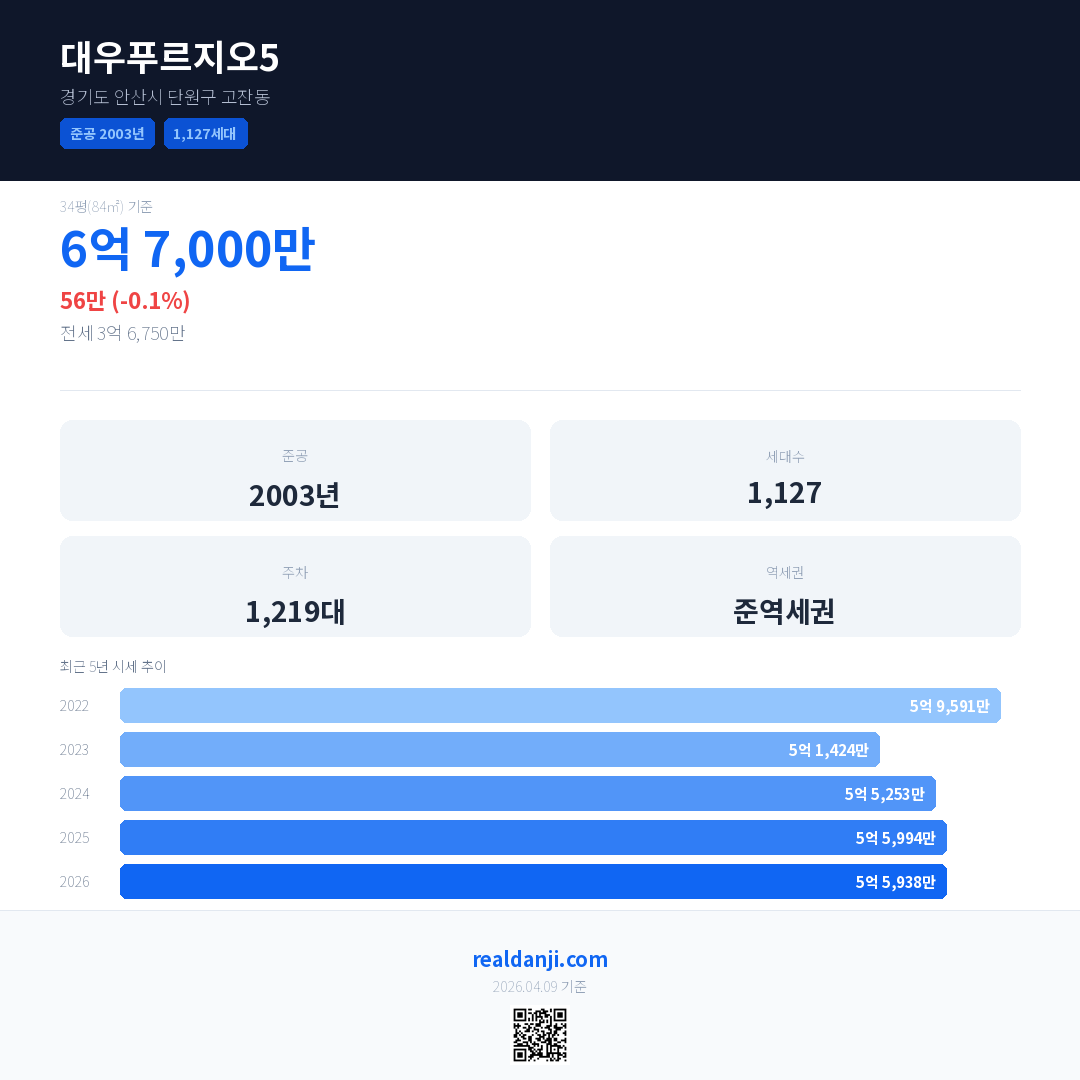 대우푸르지오5 최근 거래가는 6억 7,000만입니다. (2026-03)