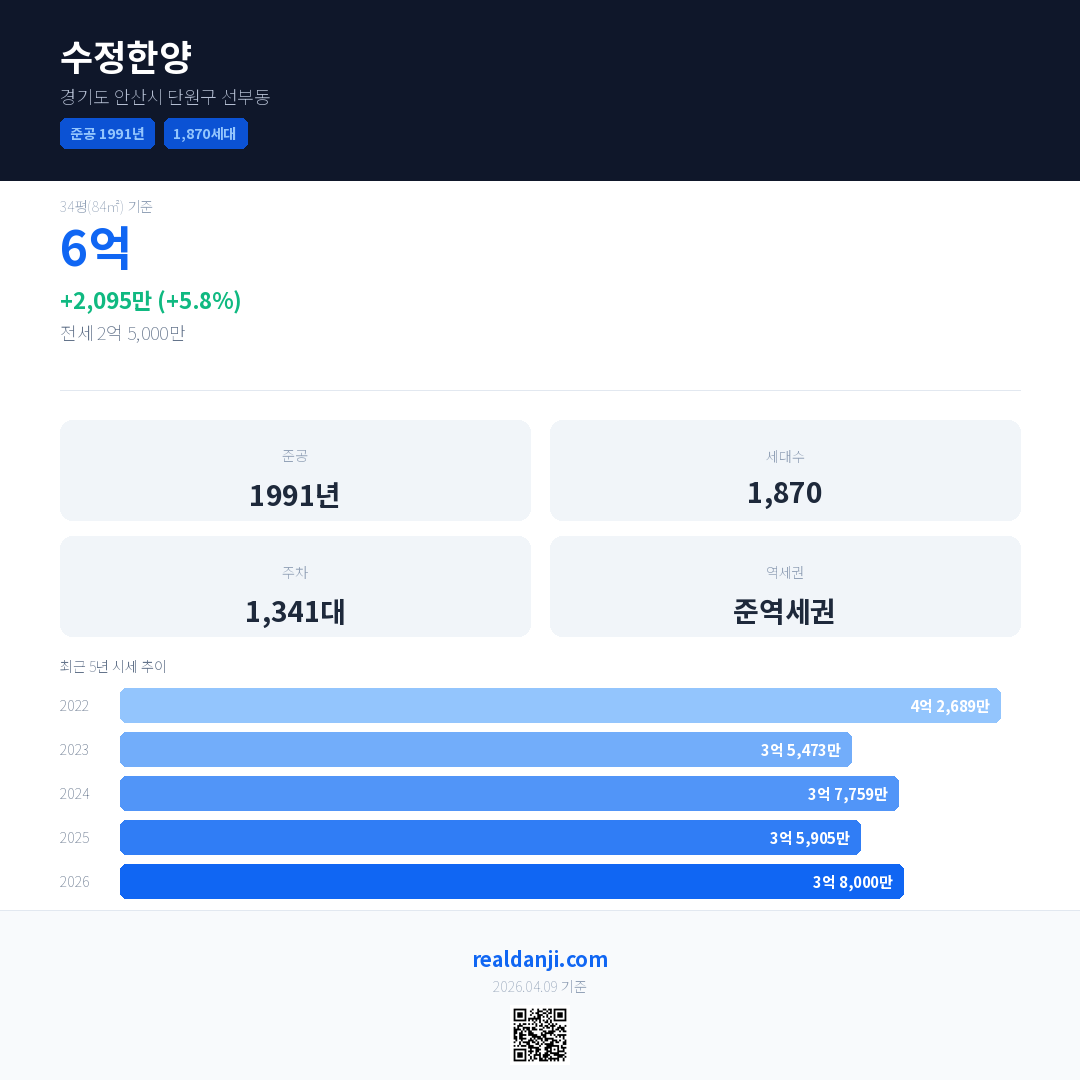 수정한양 국민평형 기준 2026년 평균 거래가는 3억 8,000만으로, 전년 대비 5.8% 상승 했습니다.