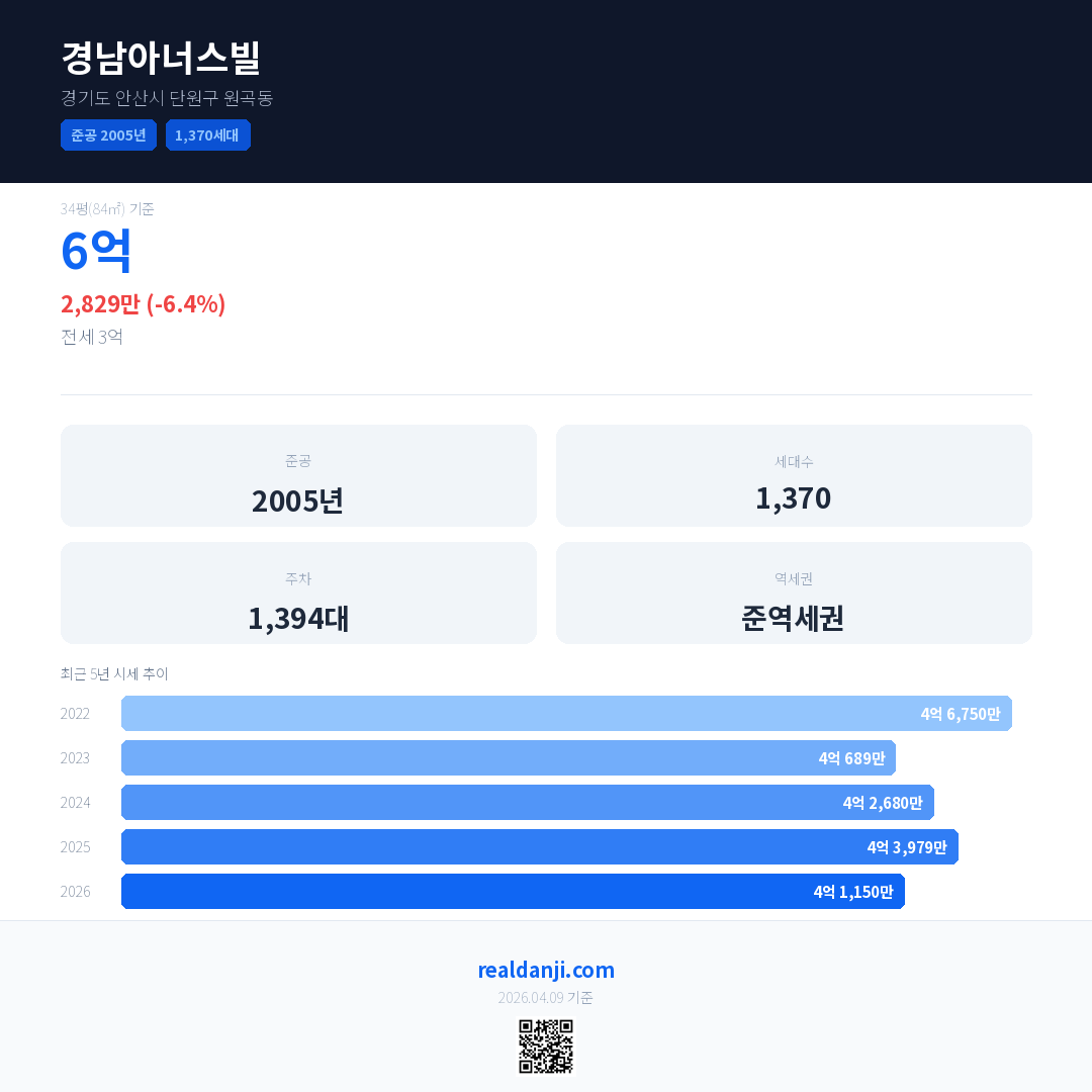 경남아너스빌 최근 거래가는 6억입니다. (2026-03)
