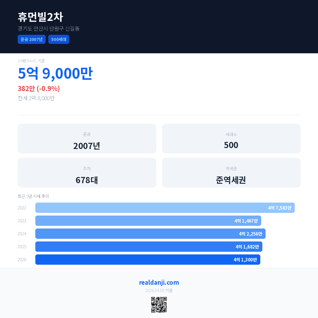 휴먼빌2차 국민평형 기준 2026년 평균 거래가는 4억 1,300만으로, 전년 대비 0.9% 하락 했습니다.