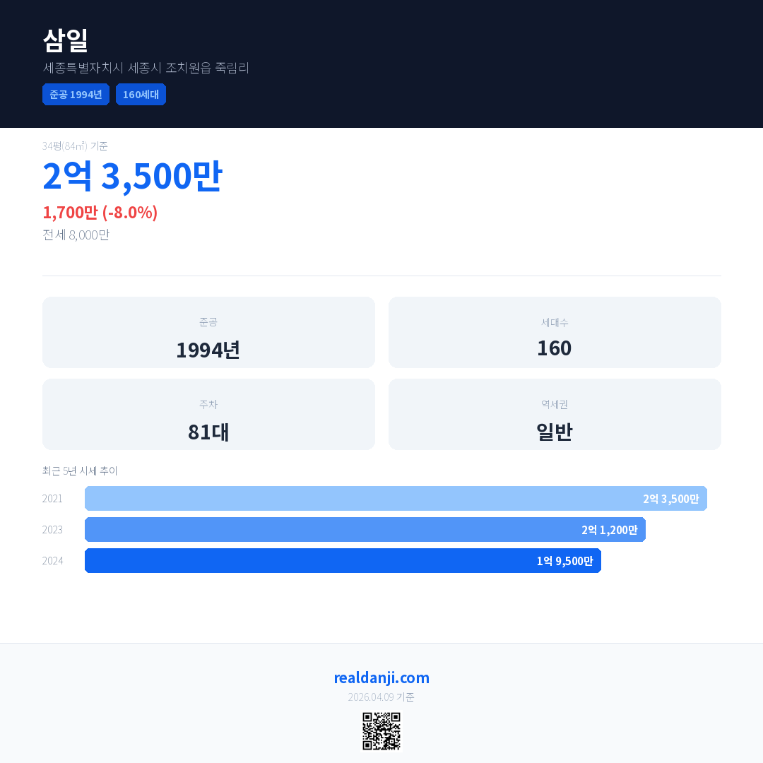 삼일 국민평형 기준 2024년 평균 거래가는 1억 9,500만으로, 전년 대비 8.0% 하락 했습니다.