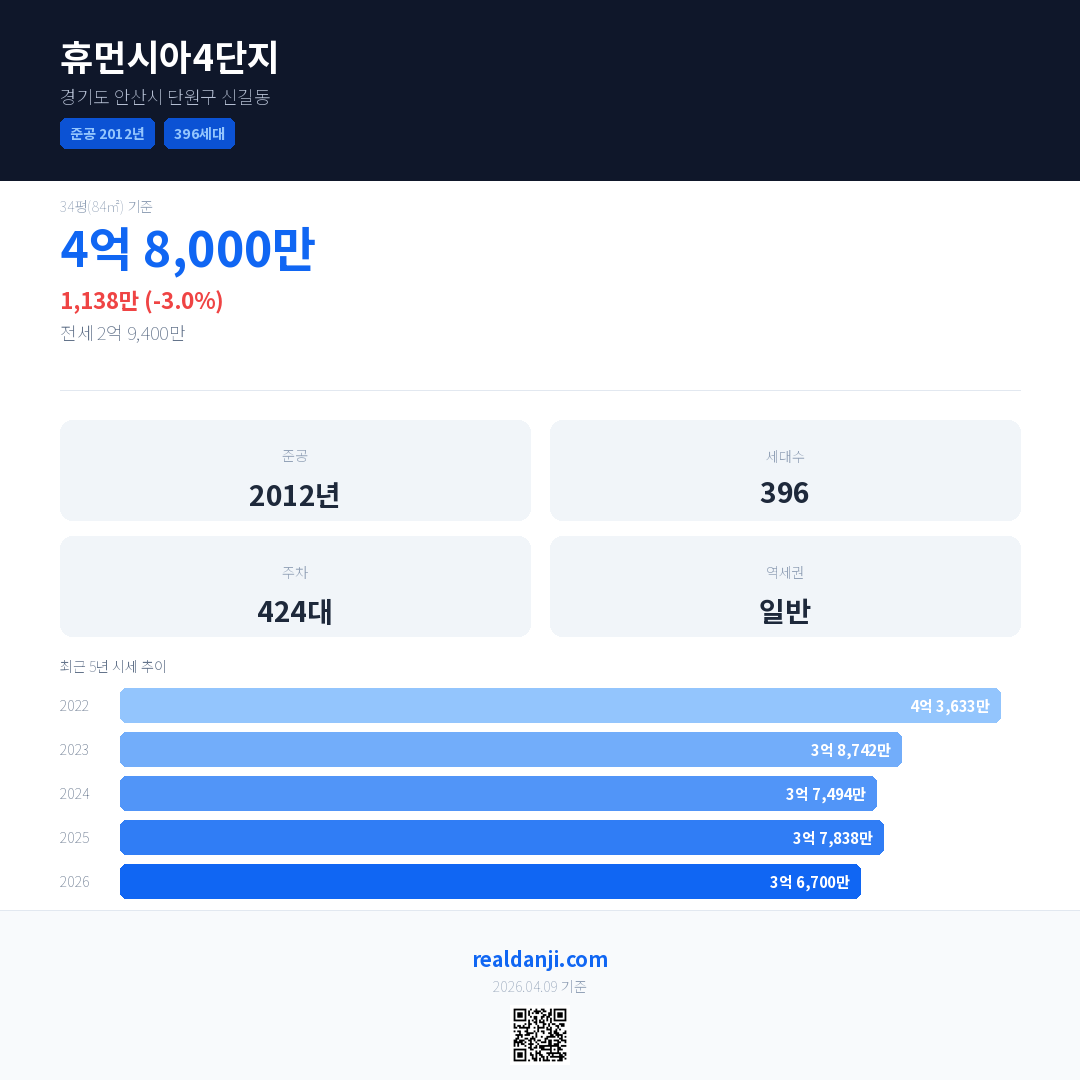 휴먼시아4단지 최근 거래가는 4억 8,000만입니다. (2026-03)