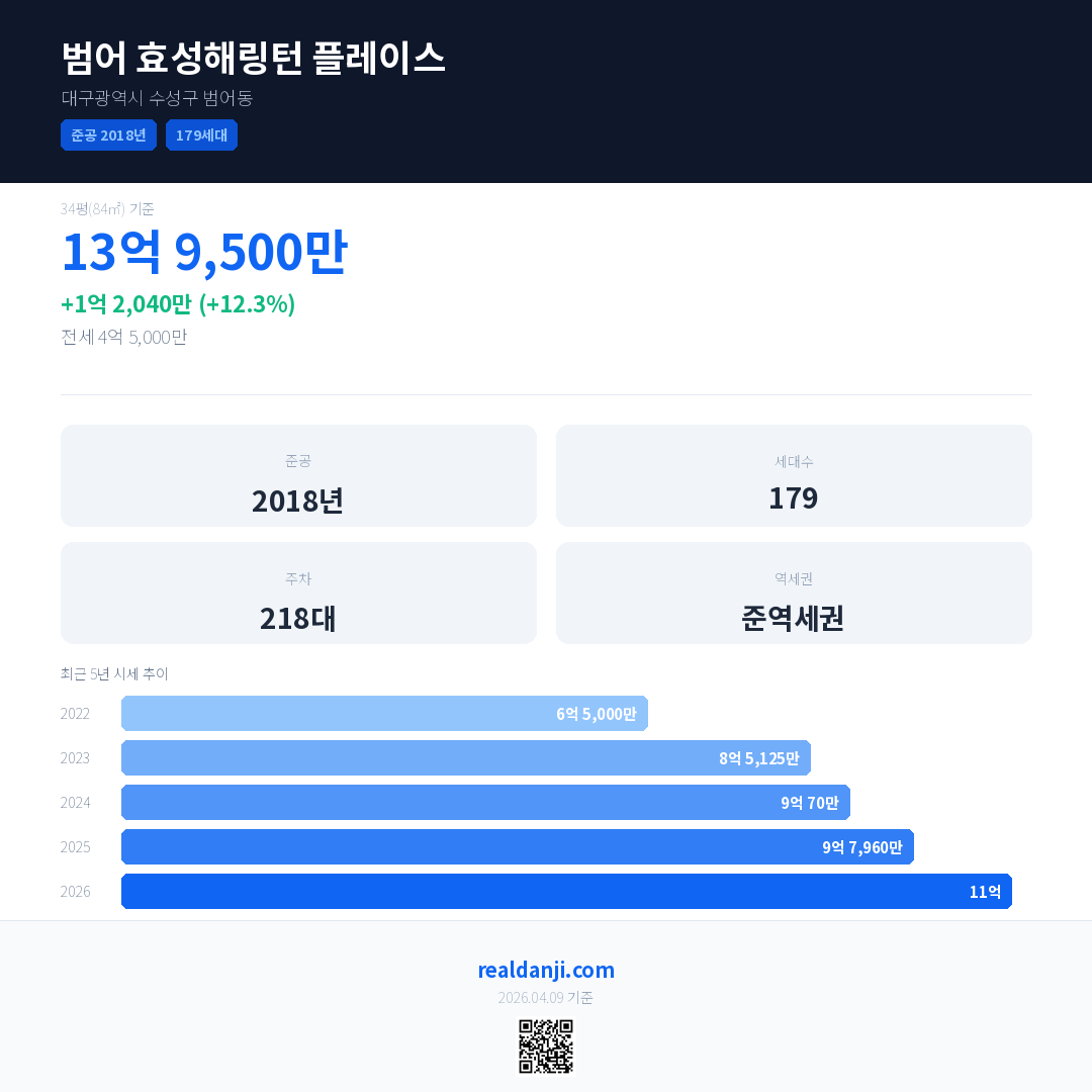 범어 효성해링턴 플레이스 국민평형 기준 2026년 평균 거래가는 11억으로, 전년 대비 12.3% 상승 했습니다.