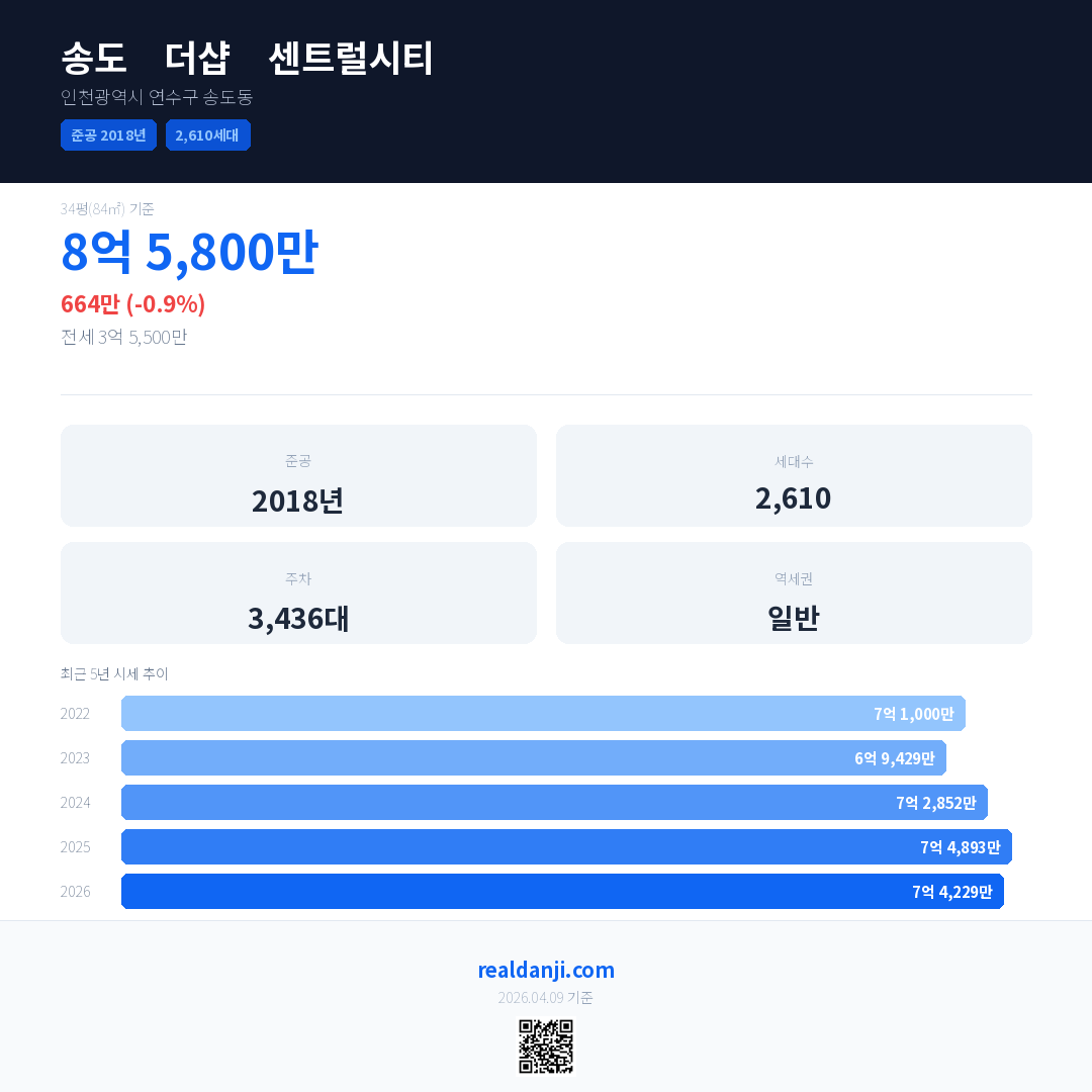 송도 더샵 센트럴시티 국민평형 기준 2026년 평균 거래가는 7억 4,229만으로, 전년 대비 0.9% 하락 했습니다.
