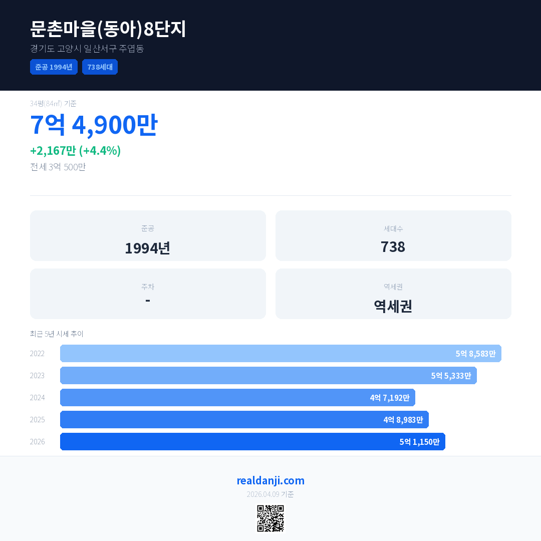 문촌마을(동아)8단지 국민평형 기준 2026년 평균 거래가는 5억 1,150만으로, 전년 대비 4.4% 상승 했습니다.