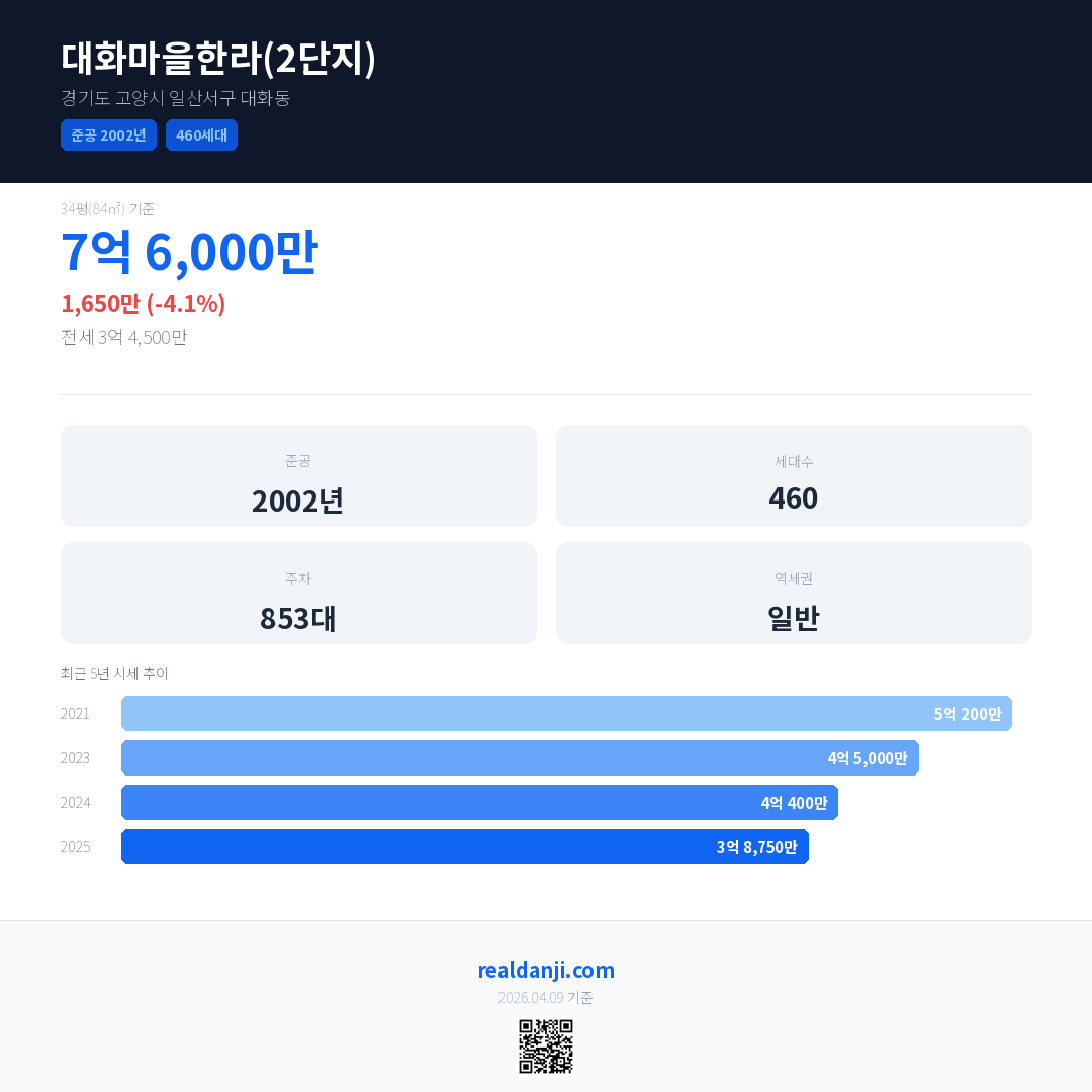 대화마을한라(2단지) 국민평형 기준 2025년 평균 거래가는 3억 8,750만으로, 전년 대비 4.1% 하락 했습니다.