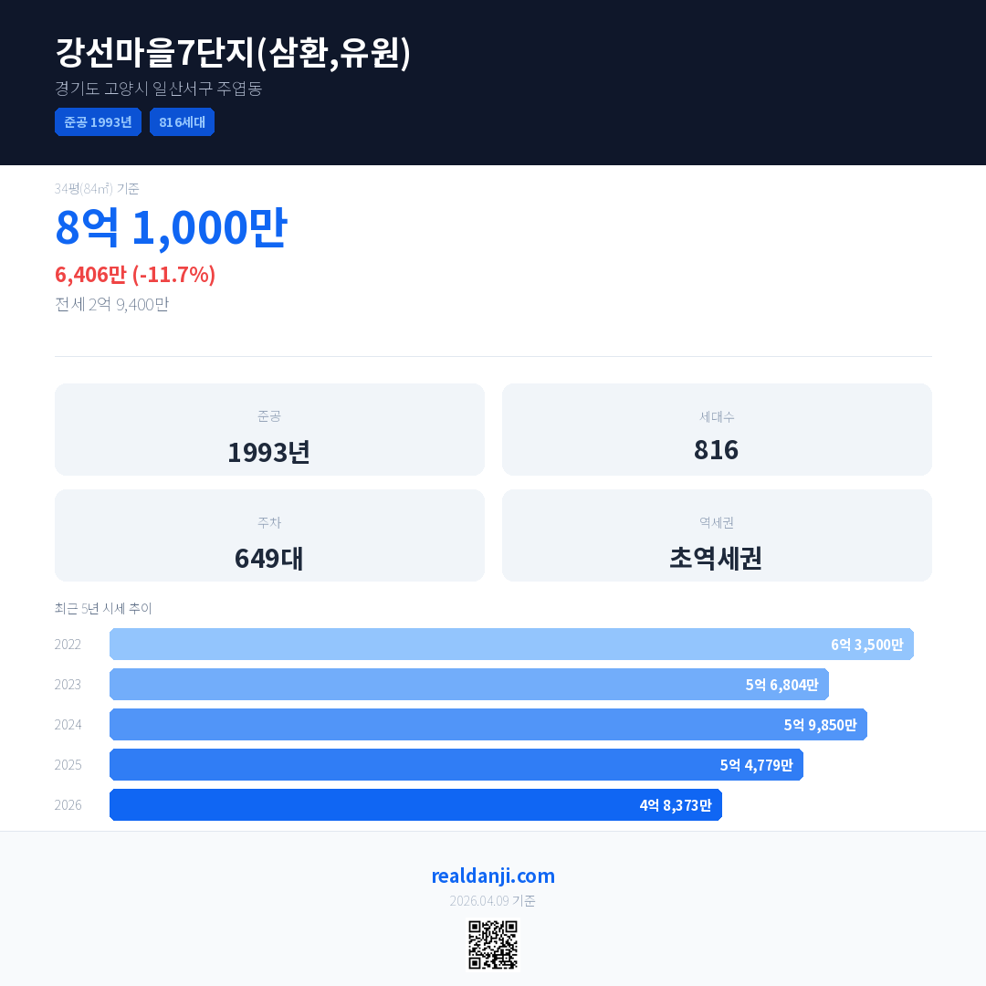 강선마을7단지(삼환,유원) 국민평형 기준 2026년 평균 거래가는 4억 8,373만으로, 전년 대비 11.7% 하락 했습니다.