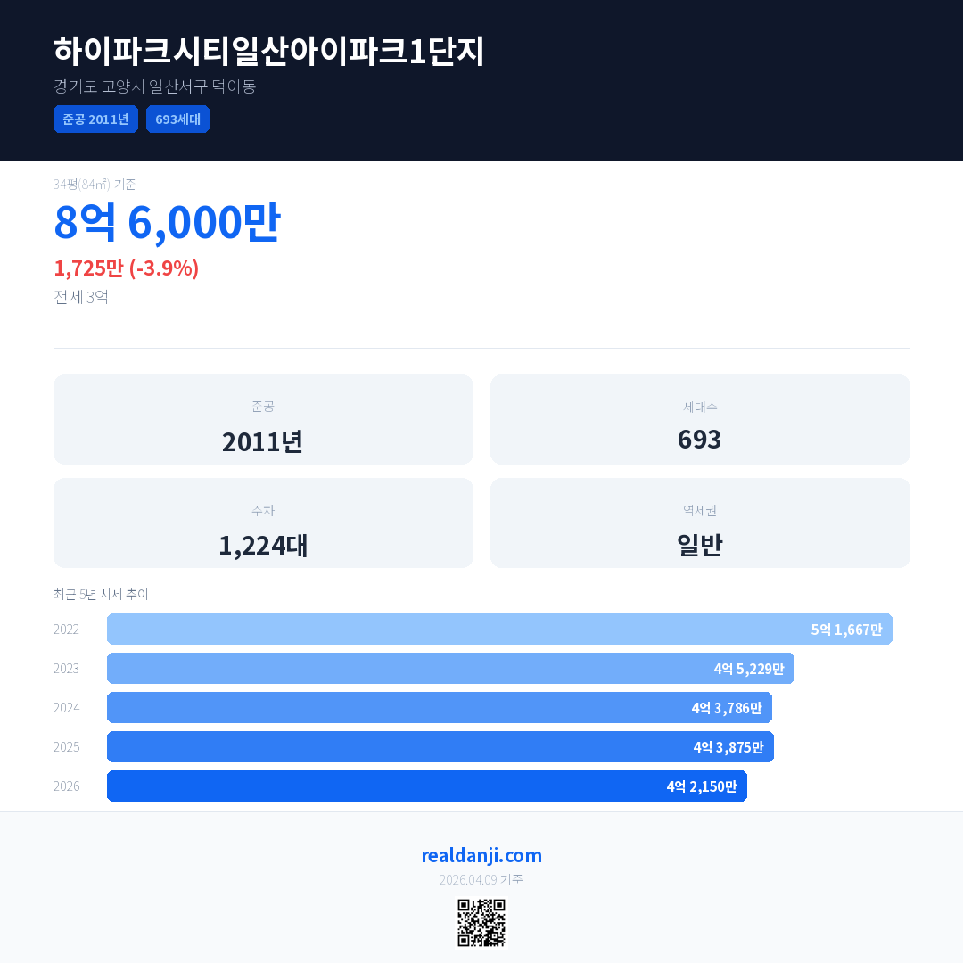 하이파크시티일산아이파크1단지 최근 거래가는 8억 6,000만입니다. (2026-03)