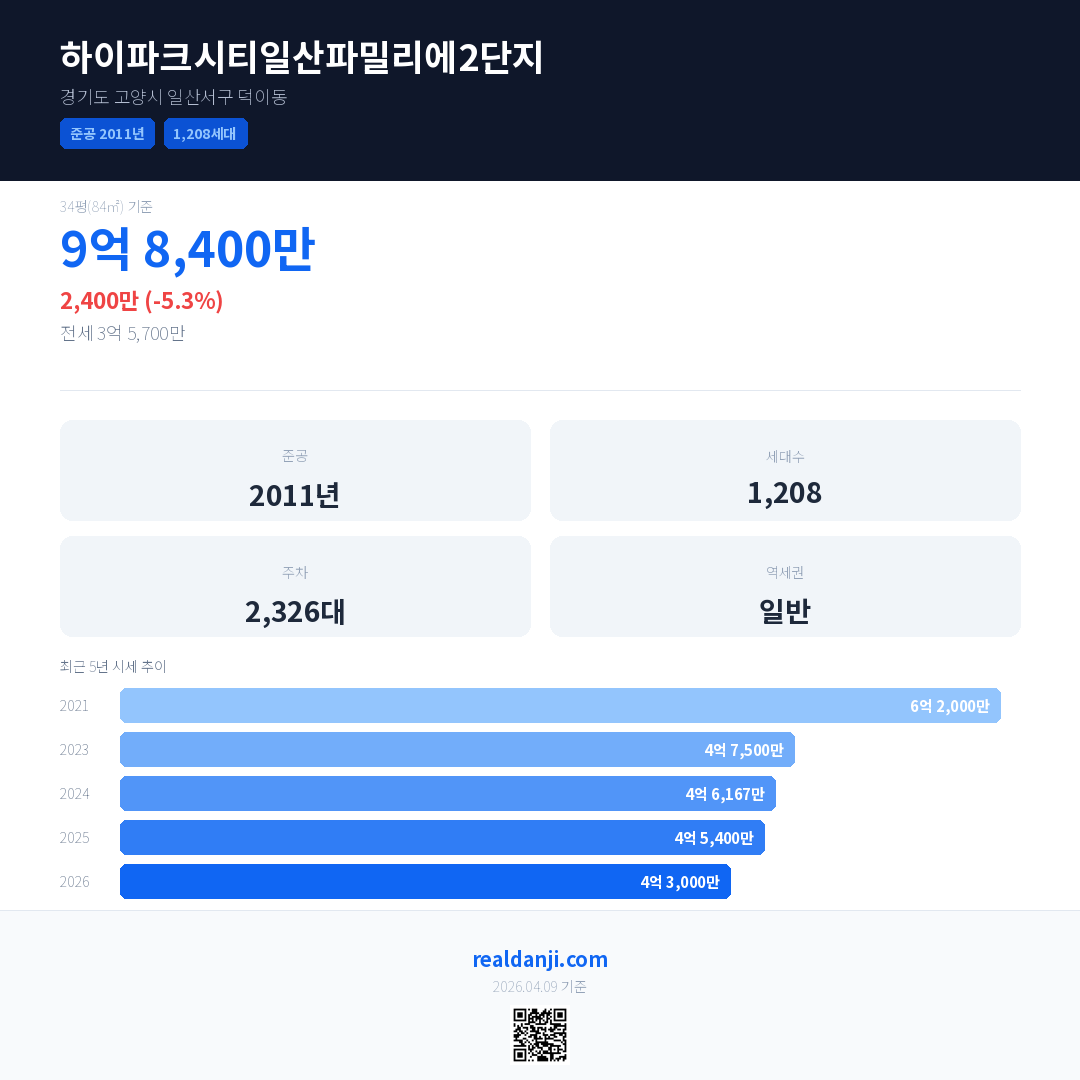 하이파크시티일산파밀리에2단지 최근 거래가는 9억 8,400만입니다. (2026-03)