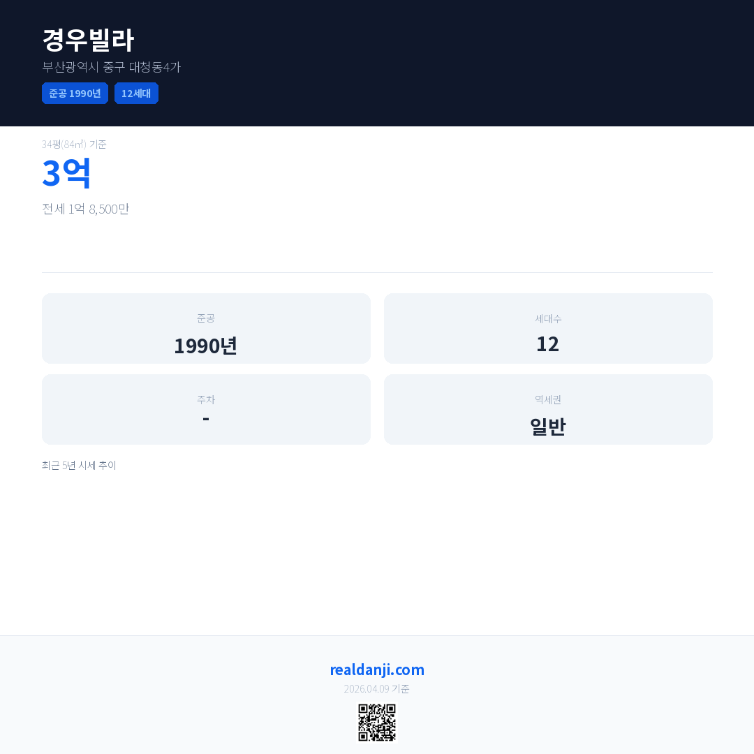 경우빌라은(는) 1990년에 준공되었으며, 현재 36년차입니다. 총 12세대 규모입니다.
