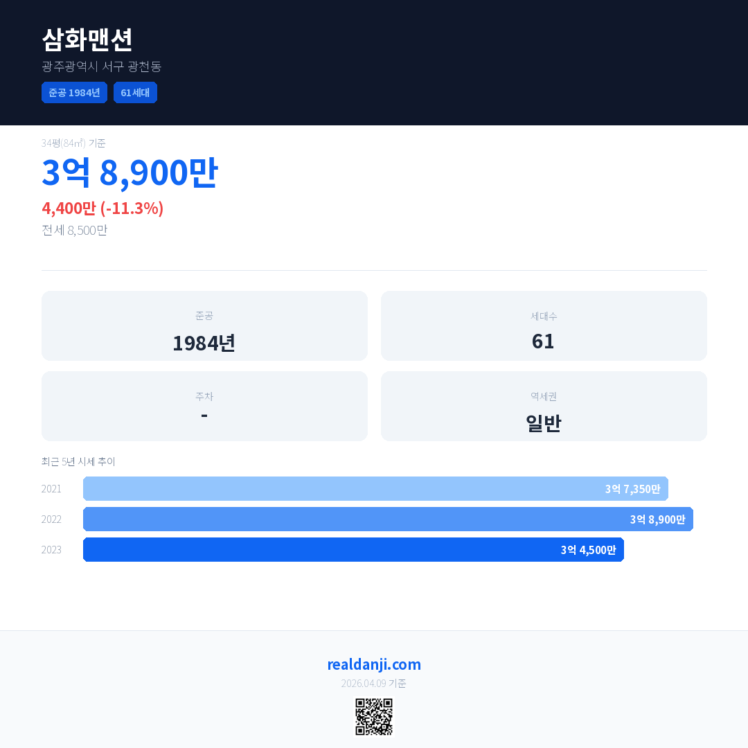 삼화맨션 국민평형 기준 2023년 평균 거래가는 3억 4,500만으로, 전년 대비 11.3% 하락 했습니다.