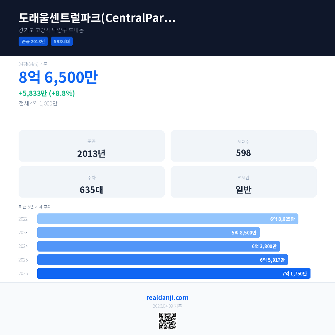 도래울센트럴파크(CentralPark) 최근 거래가는 8억 6,500만입니다. (2026-04)