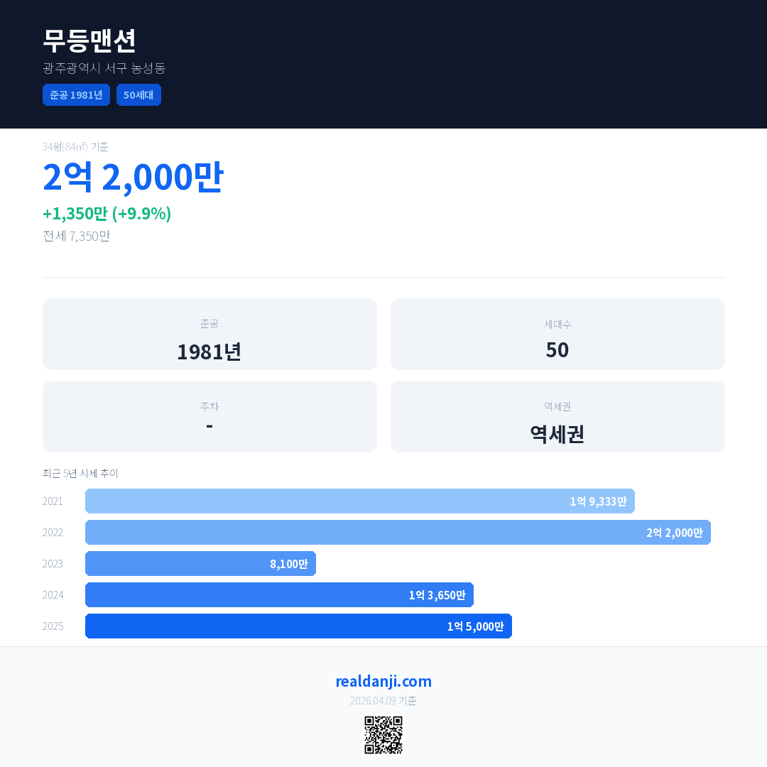무등맨션 국민평형 기준 2025년 평균 거래가는 1억 5,000만으로, 전년 대비 9.9% 상승 했습니다.