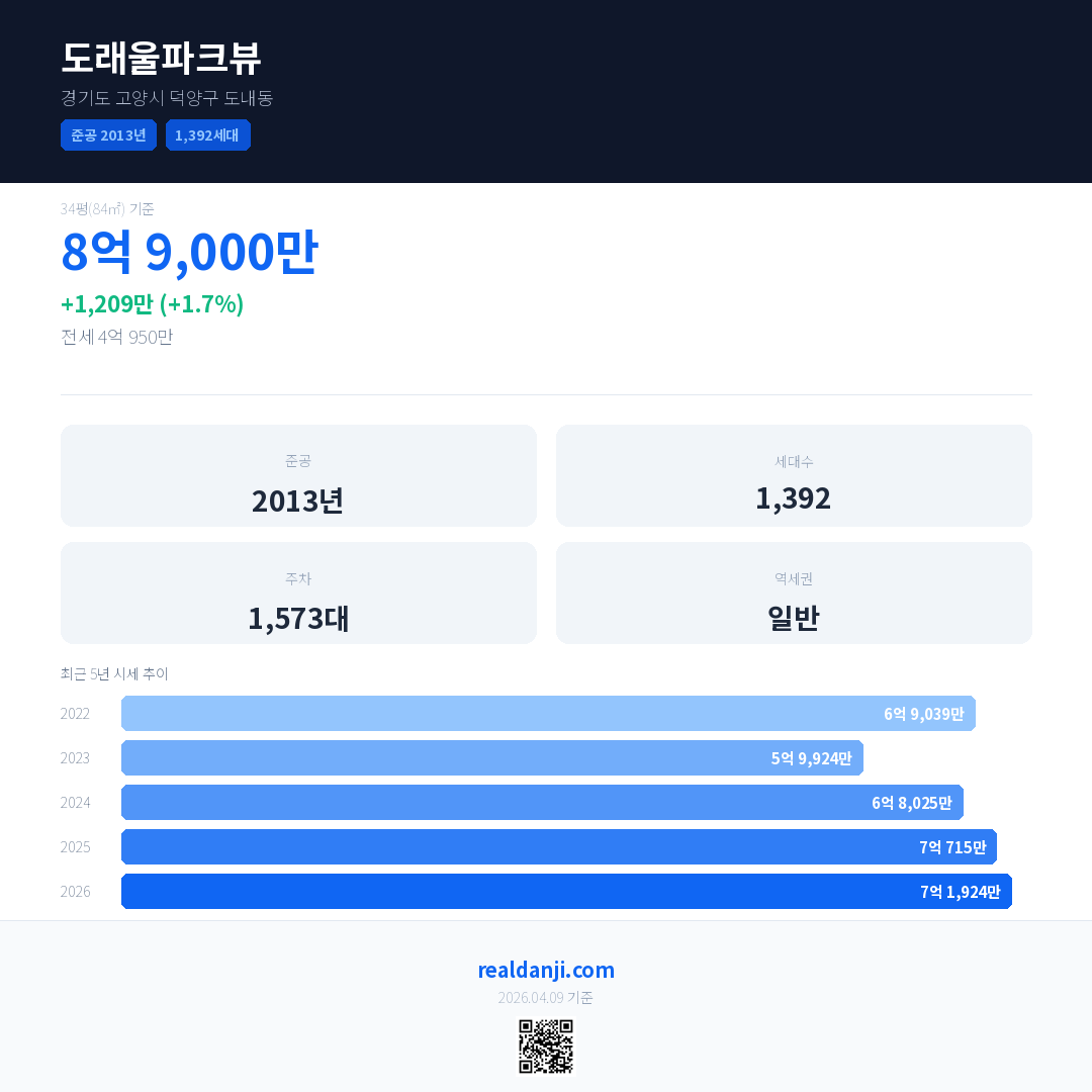 도래울파크뷰은(는) 2013년에 준공되었으며, 현재 13년차입니다. 총 1,392세대 규모입니다.