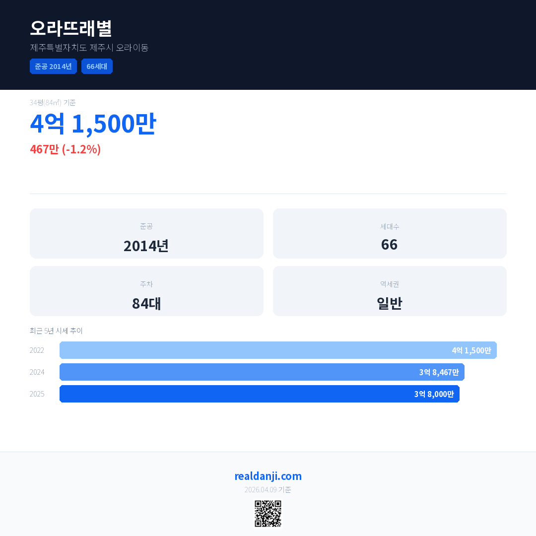 오라뜨래별 국민평형 기준 2025년 평균 거래가는 3억 8,000만으로, 전년 대비 1.2% 하락 했습니다.