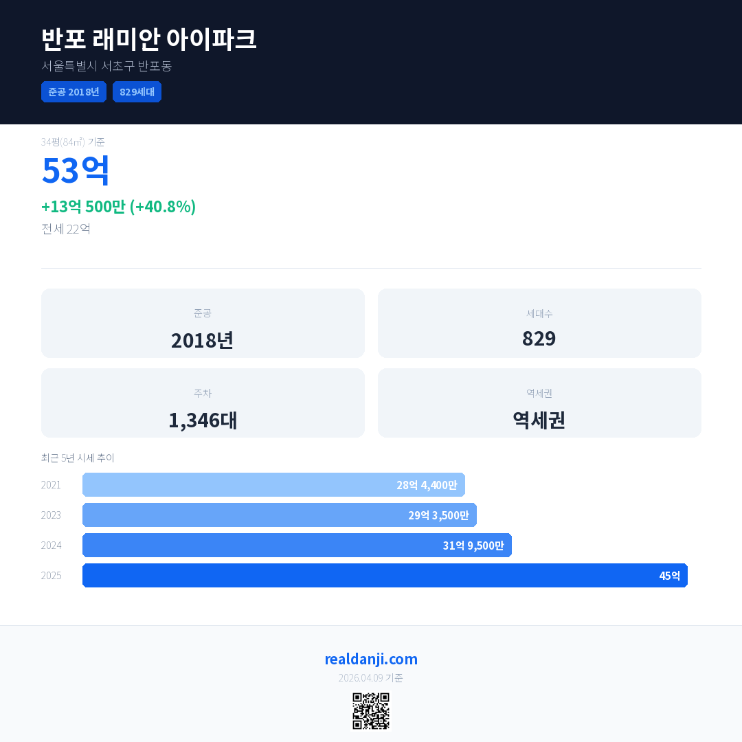 반포 래미안 아이파크 최근 거래가는 53억입니다. (2025-12)
