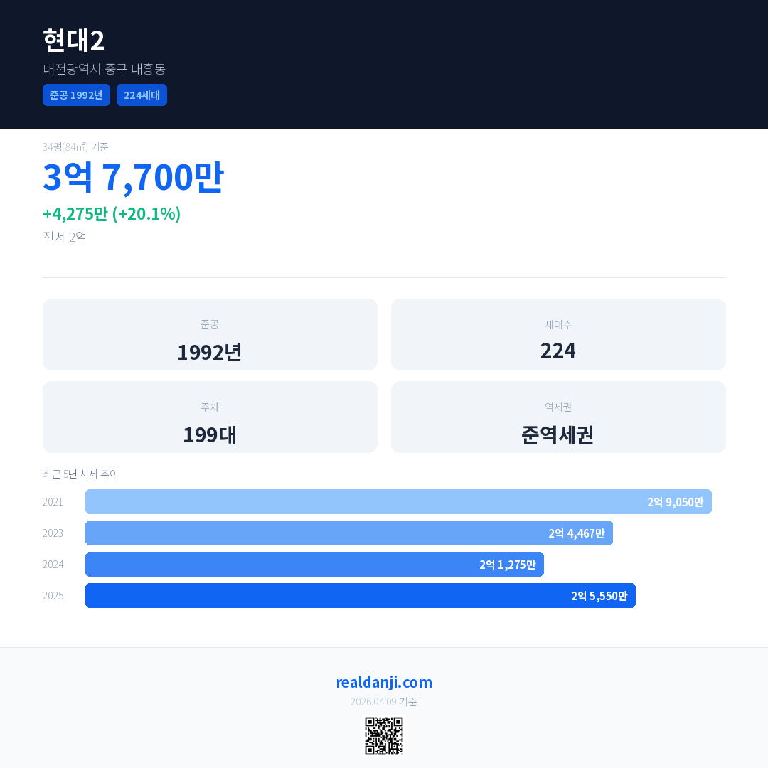 현대2 국민평형 기준 2025년 평균 거래가는 2억 5,550만으로, 전년 대비 20.1% 상승 했습니다.