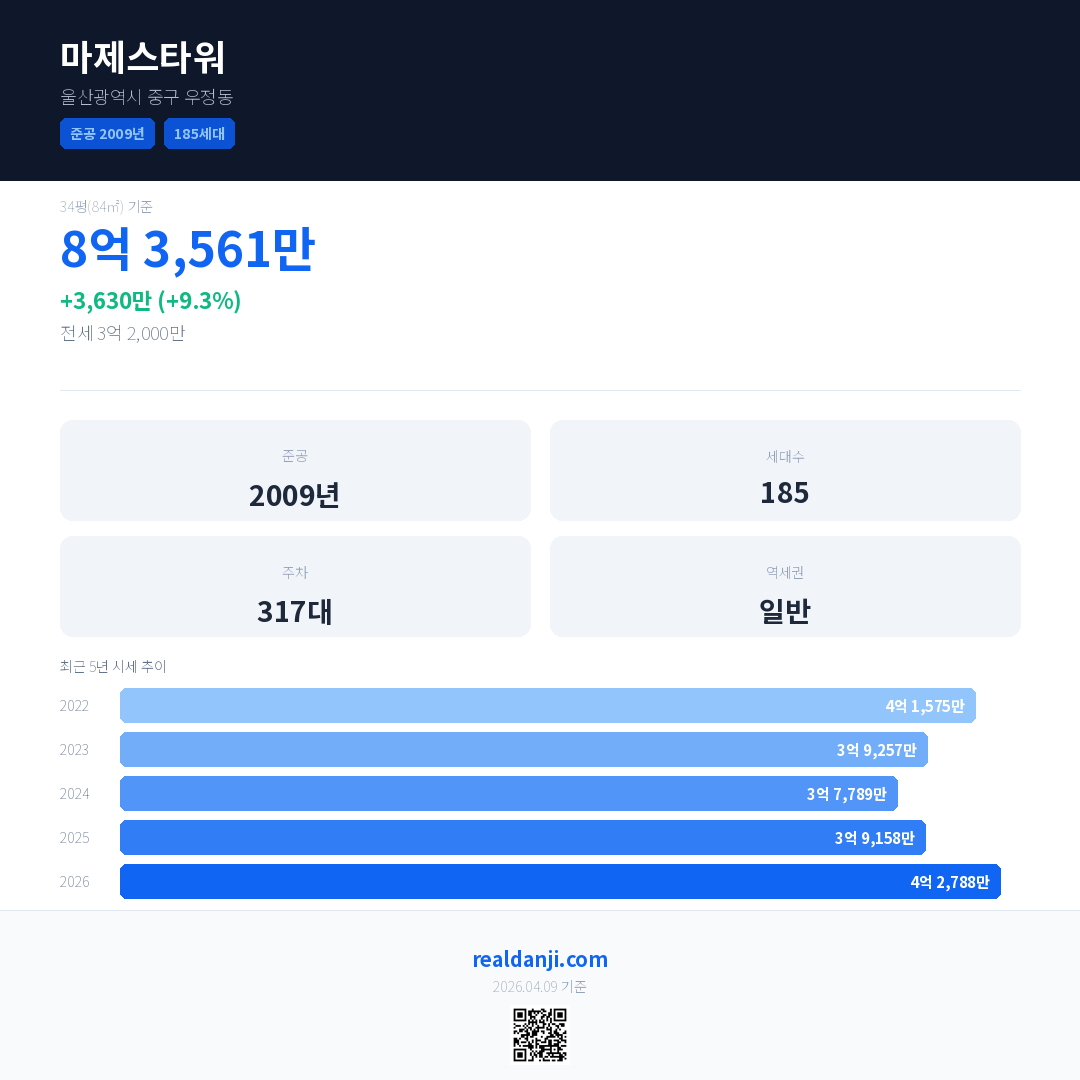 마제스타워 국민평형 기준 2026년 평균 거래가는 4억 2,788만으로, 전년 대비 9.3% 상승 했습니다.