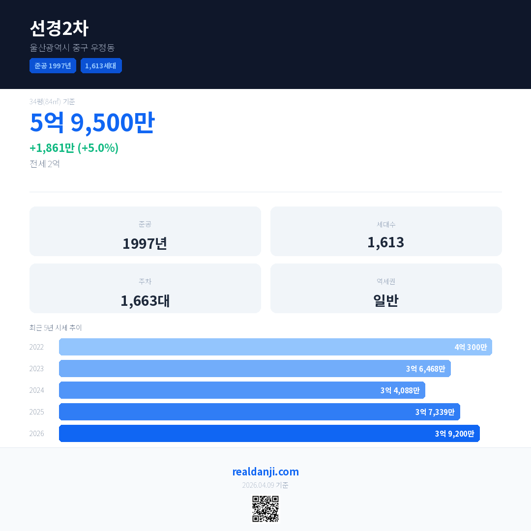선경2차 국민평형 기준 2026년 평균 거래가는 3억 9,200만으로, 전년 대비 5.0% 상승 했습니다.