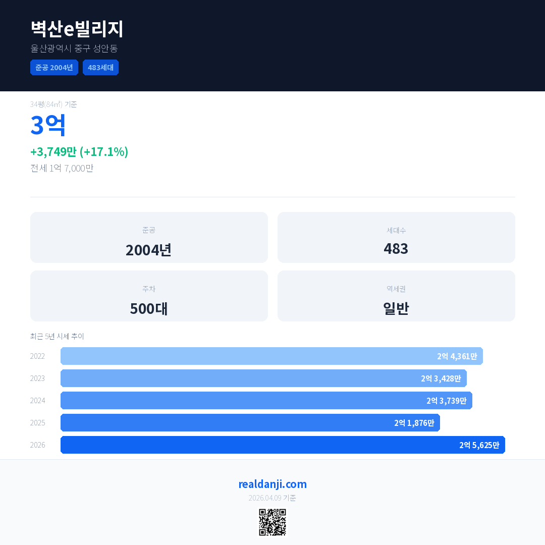 벽산e빌리지 국민평형 기준 2026년 평균 거래가는 2억 5,625만으로, 전년 대비 17.1% 상승 했습니다.