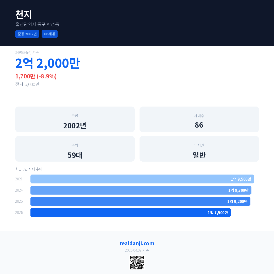 천지 최근 거래가는 2억 2,000만입니다. (2026-03)