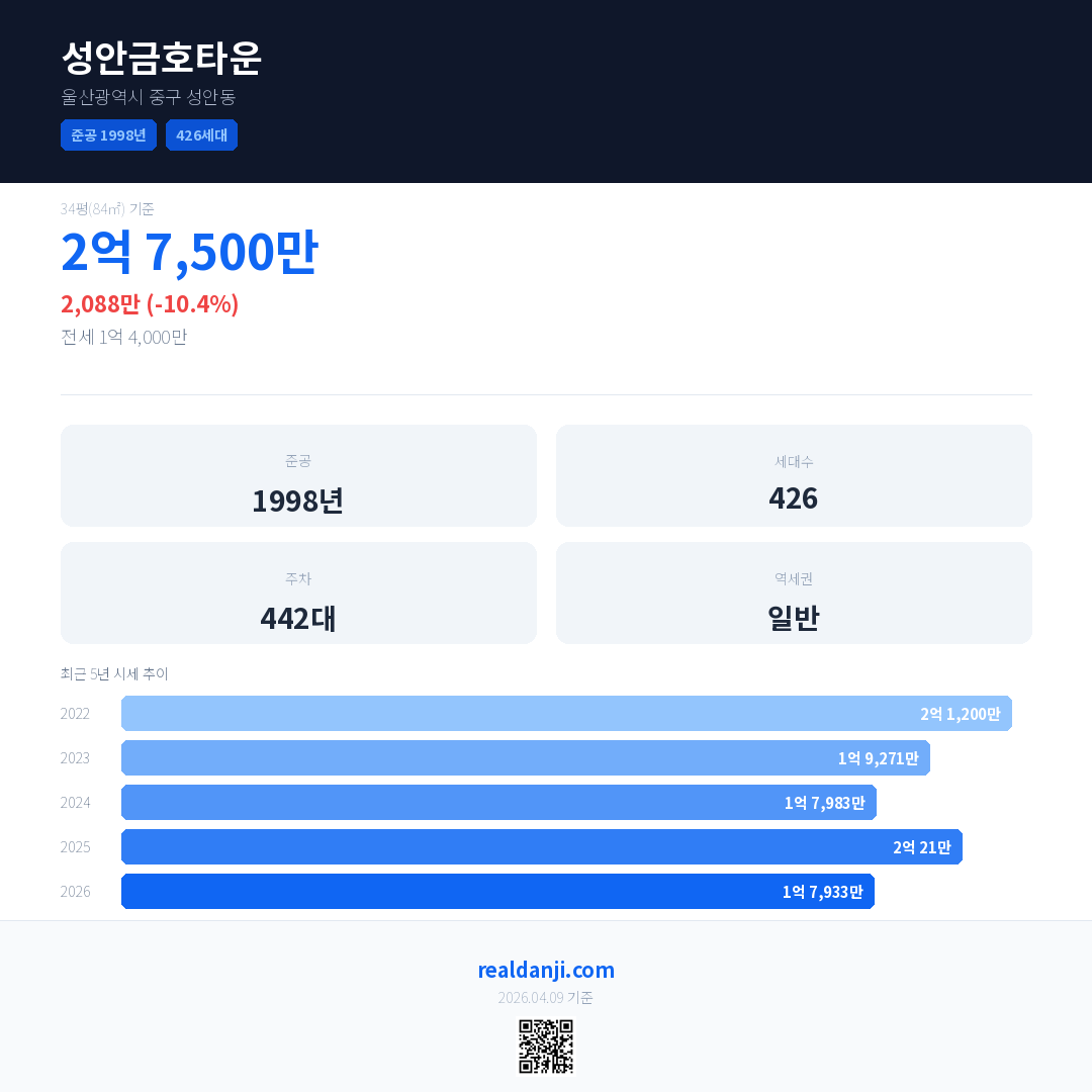 성안금호타운 국민평형 기준 2026년 평균 거래가는 1억 7,933만으로, 전년 대비 10.4% 하락 했습니다.
