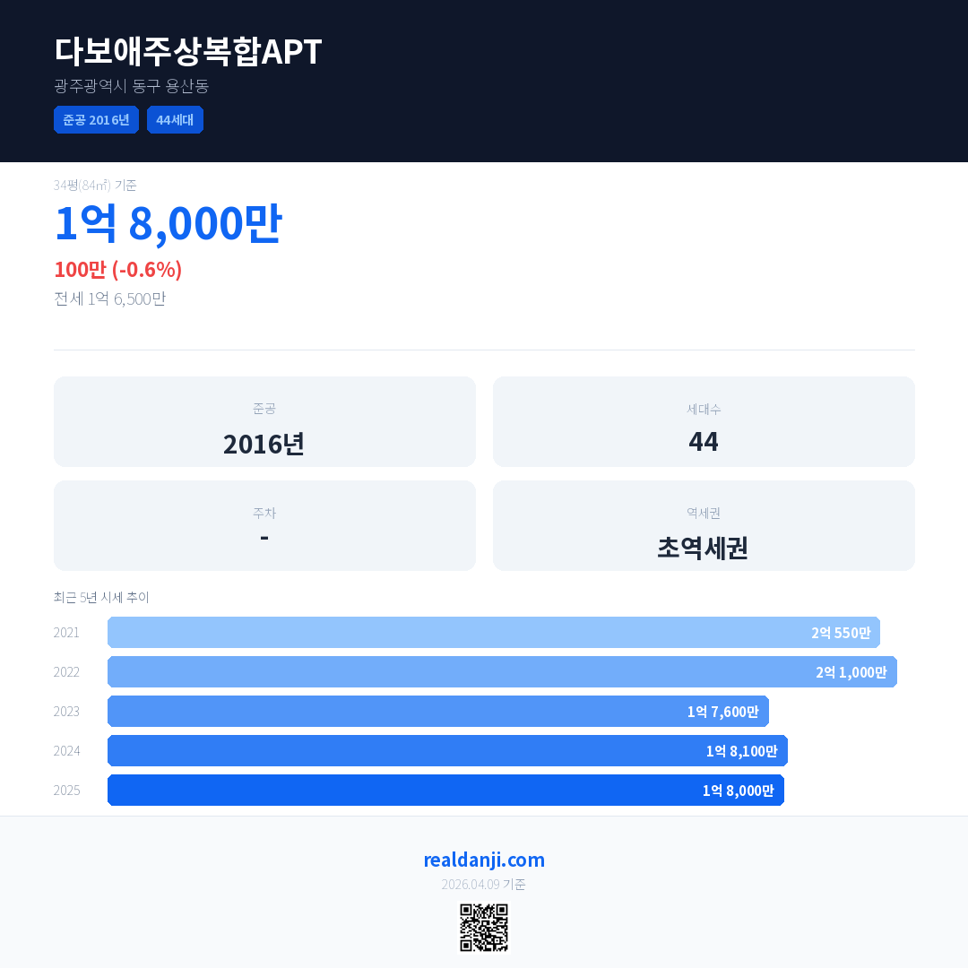 다보애주상복합APT 국민평형 기준 2025년 평균 거래가는 1억 8,000만으로, 전년 대비 0.6% 하락 했습니다.