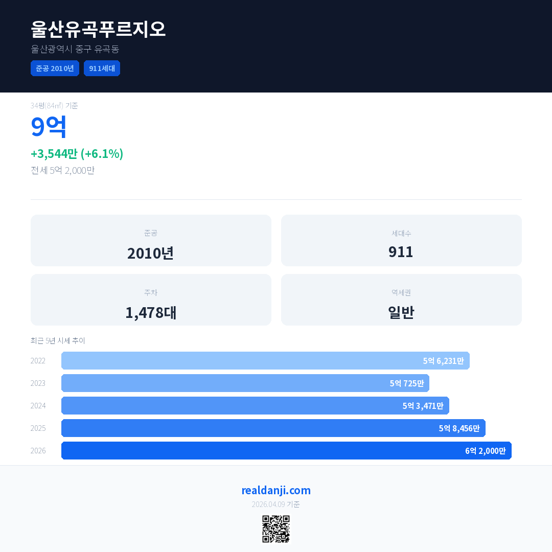 울산유곡푸르지오 최근 거래가는 9억입니다. (2026-03)