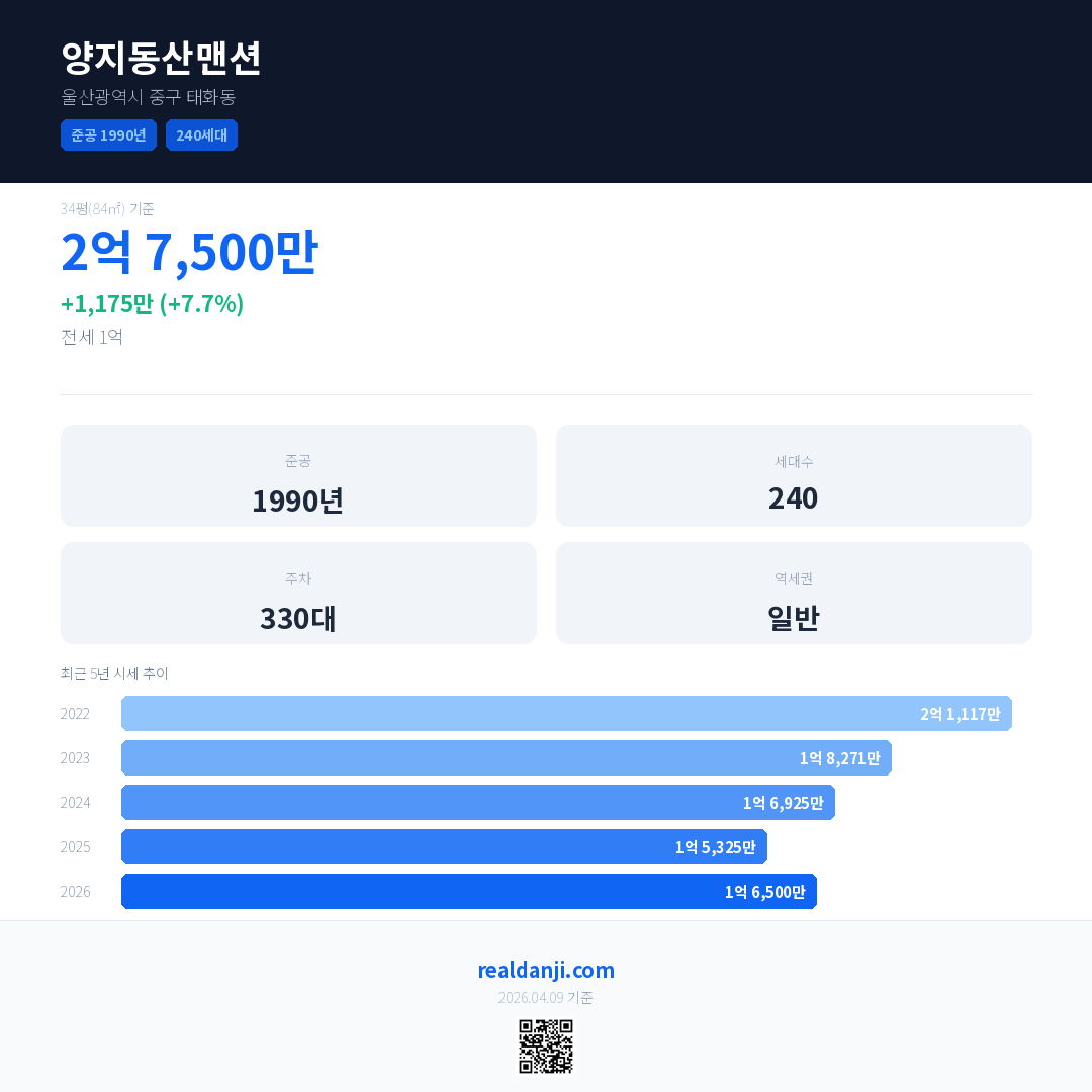 양지동산맨션 국민평형 기준 2026년 평균 거래가는 1억 6,500만으로, 전년 대비 7.7% 상승 했습니다.