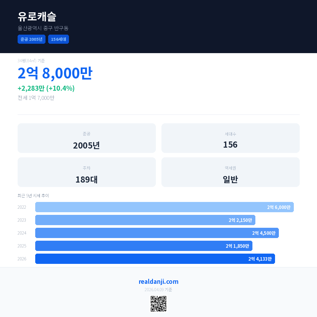 유로캐슬 국민평형 기준 2026년 평균 거래가는 2억 4,133만으로, 전년 대비 10.4% 상승 했습니다.